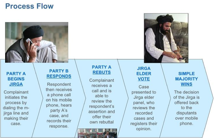 In 2009, the President of the Internet Bar Organization, Jeff Aresty, collaborated with a group of mediators, conflict resolution experts and technologists to formulate the idea of an M-Jirga, a decision-making body that could resolve disputes between Afghan disputants remotely, via mobile phones, which are ubiquitous in Afghanistan and have exploded in uptake since the overthrow of the Taliban. The presentation below, by Colin Rule, outlines the M-Jirga concept, which paved the way for IBO’s further research in ways to deliver dispute resolution tools to rural Afghans through mobile technologies.